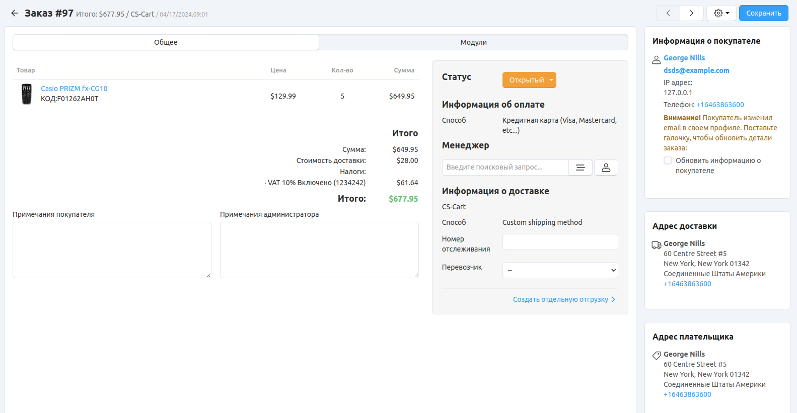 - Отредактировать информацию и адрес покупателя: нажмите на одну из иконок редактирования на панели справа, измените данные во всплывающем окне и нажмите кнопку Обновить.