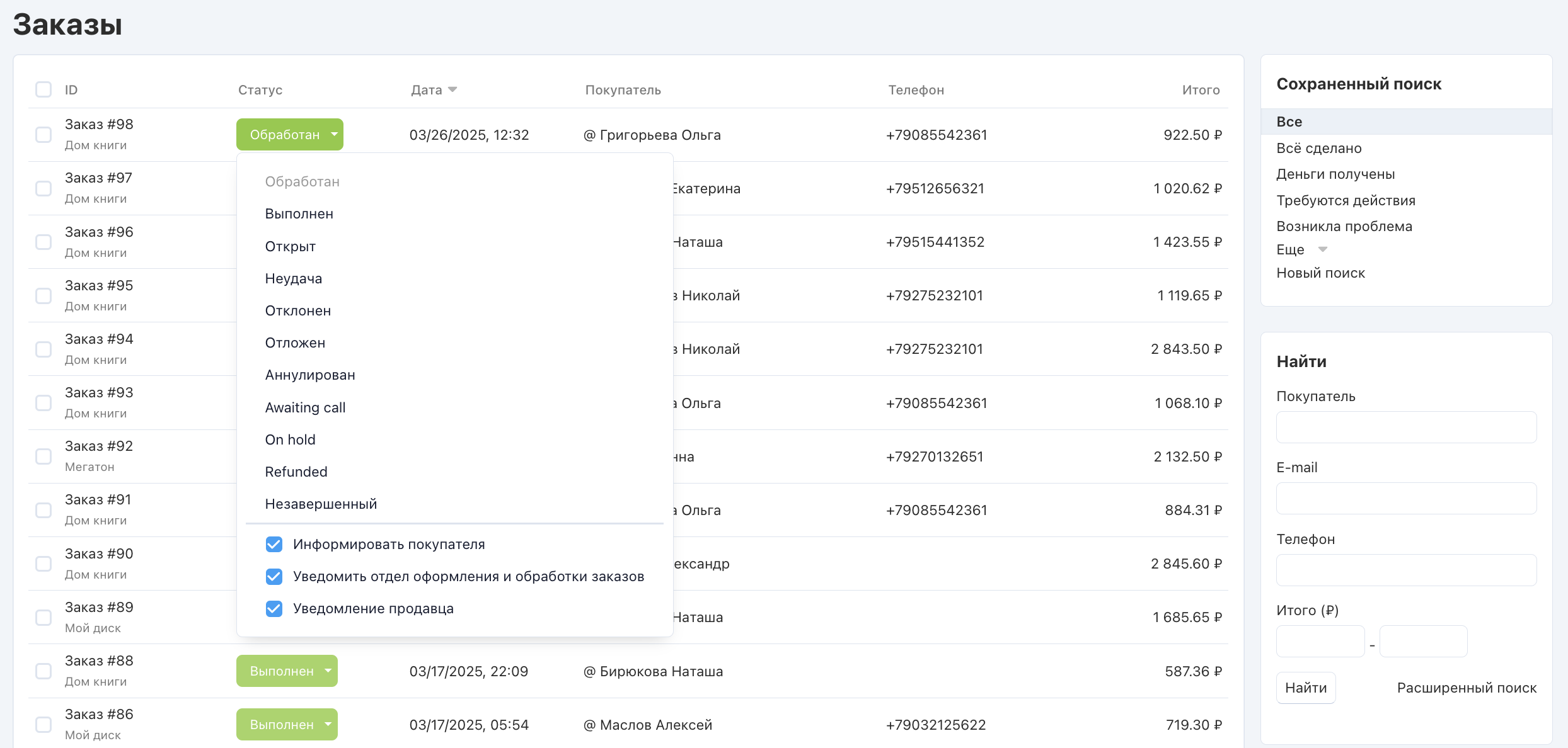 Как изменить статус заказа¶ Откройте страницу Заказы → Заказы в панели администратора. Найдите нужный заказ и нажмите на его текущий статус. Откроется список со всеми доступными статусами. Выберите нужный статус.