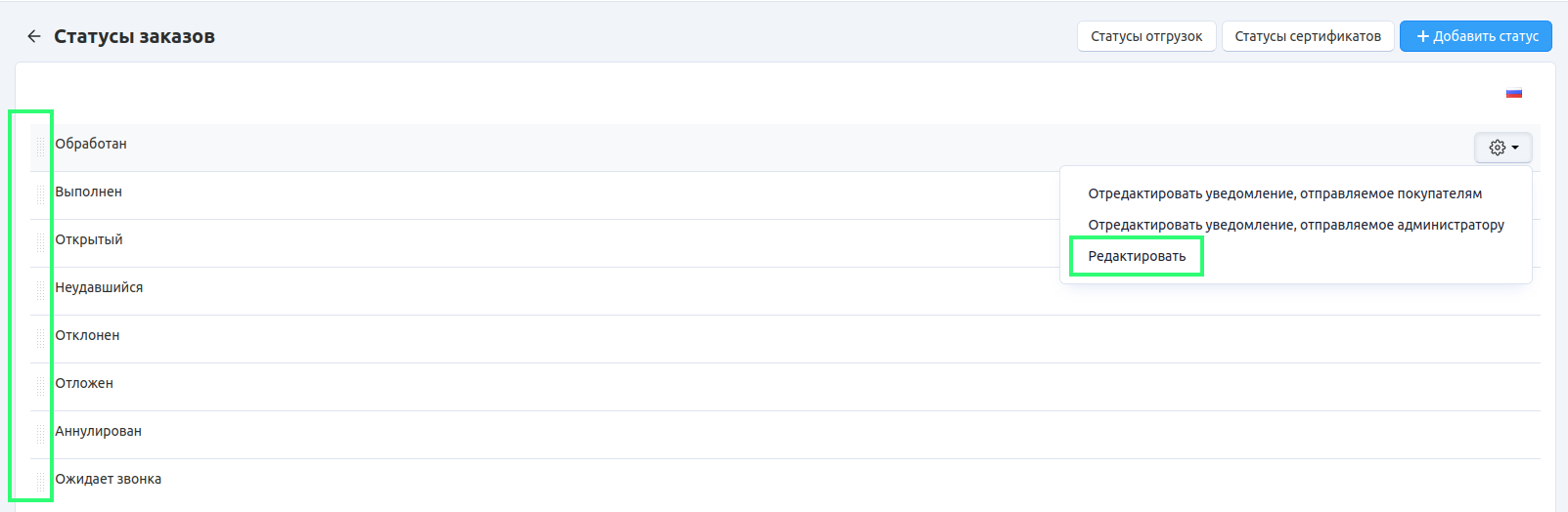 Откройте страницу Настройки → Статусы в панели администратора магазина.