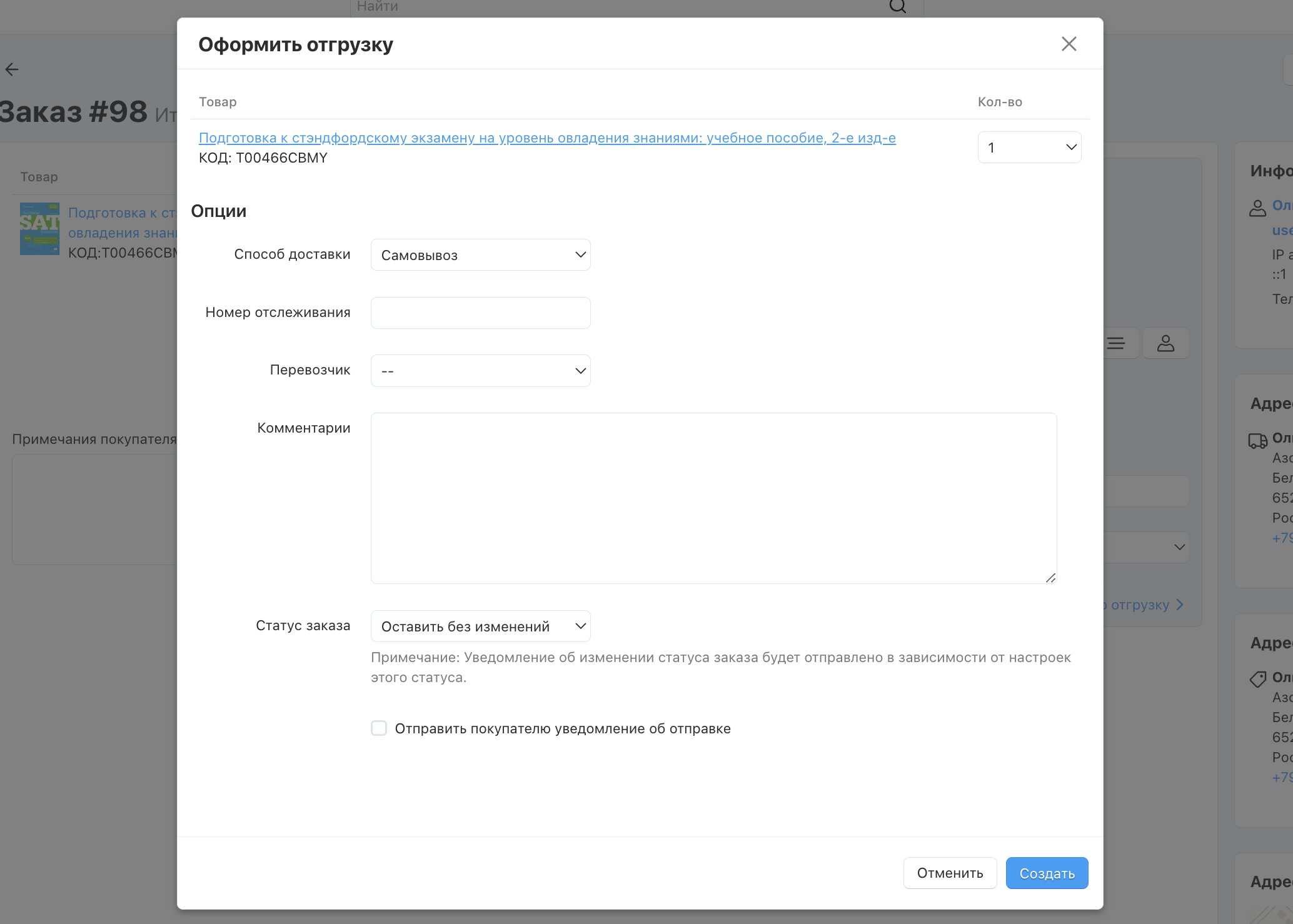 Если вы оставите поля Номер отслеживания и Перевозчик пустыми, то отгрузка не будет создана.