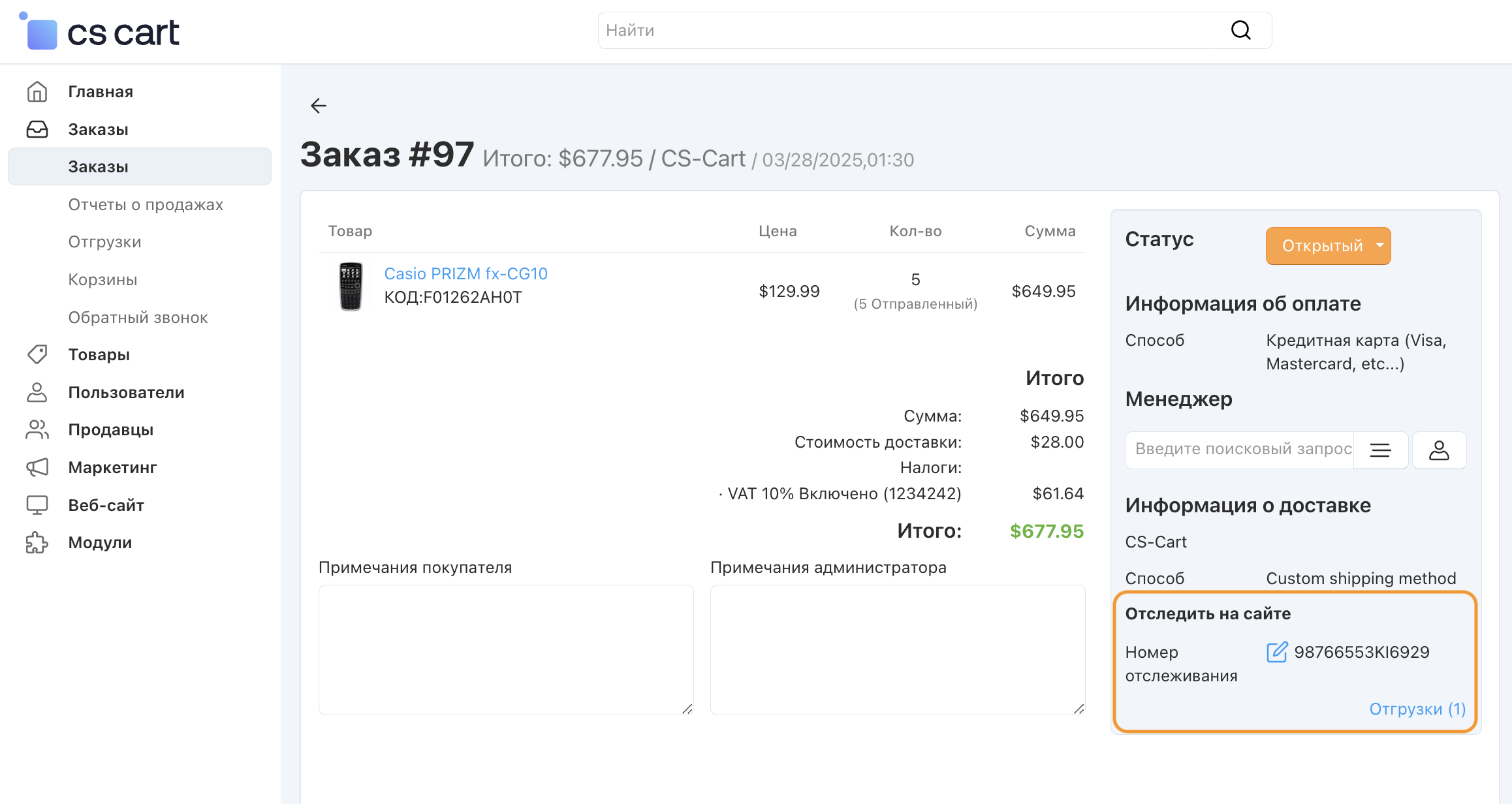 Номера отслеживания, которые вы введёте, появятся в разделе Информация о доставке. Если вы выберите перевозчика, то номера отслеживания будут ссылками, ведущими на страницу отслеживания на сайте перевозчика.
