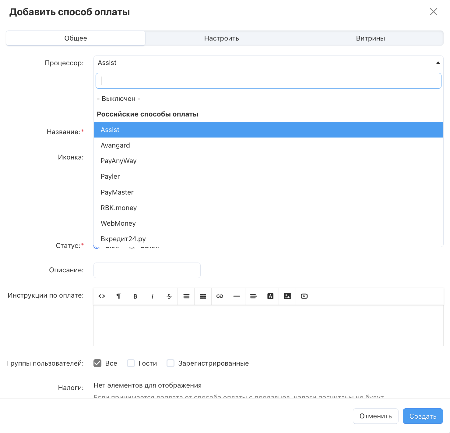 3. Выберите процессор оплаты “Assist” в окне редактирования способа оплаты.