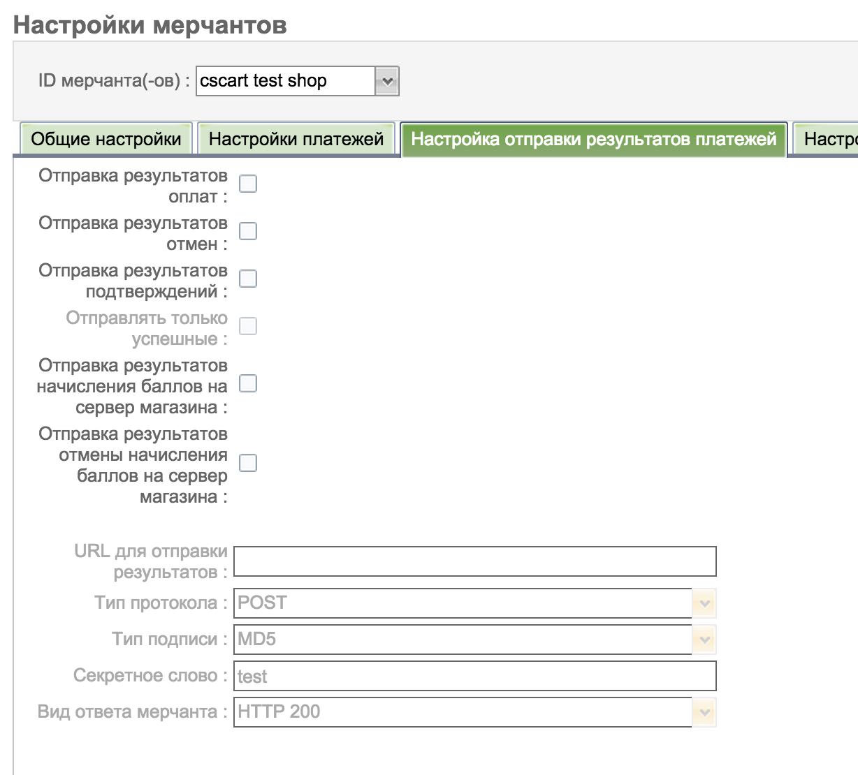 Настройку отправки результатов платежей необходимо оставить пустым.