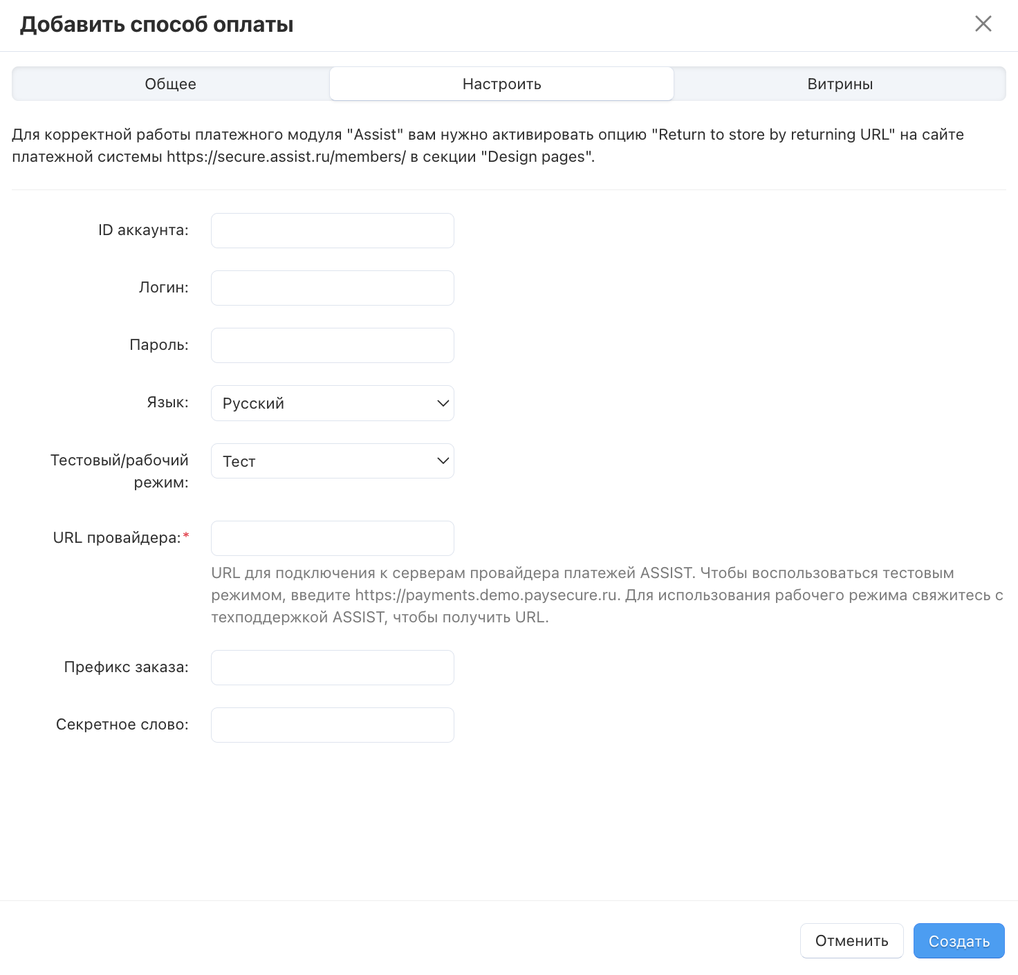 • URL провайдера — URL для подключения к серверам провайдера платежей ASSIST;
