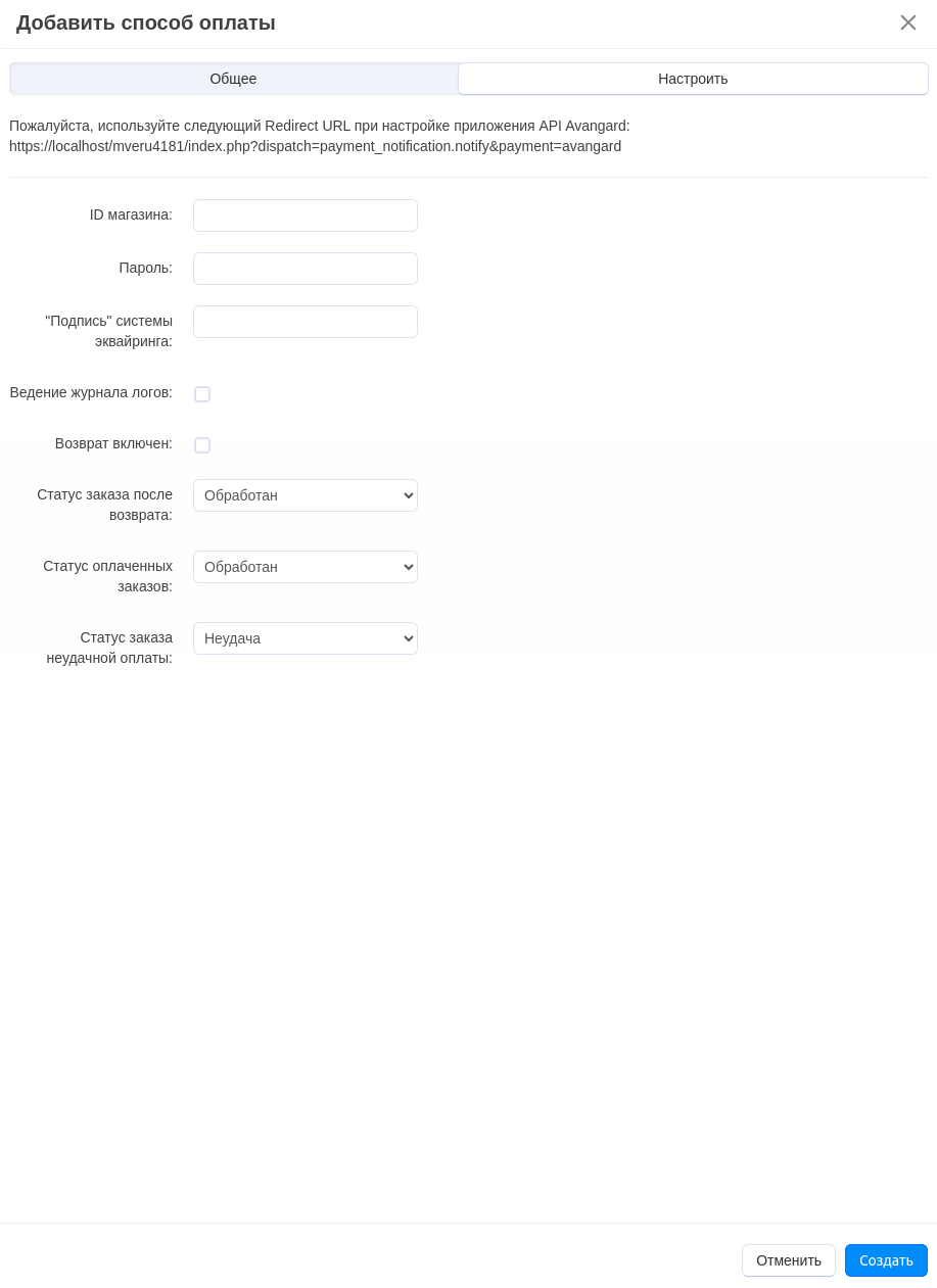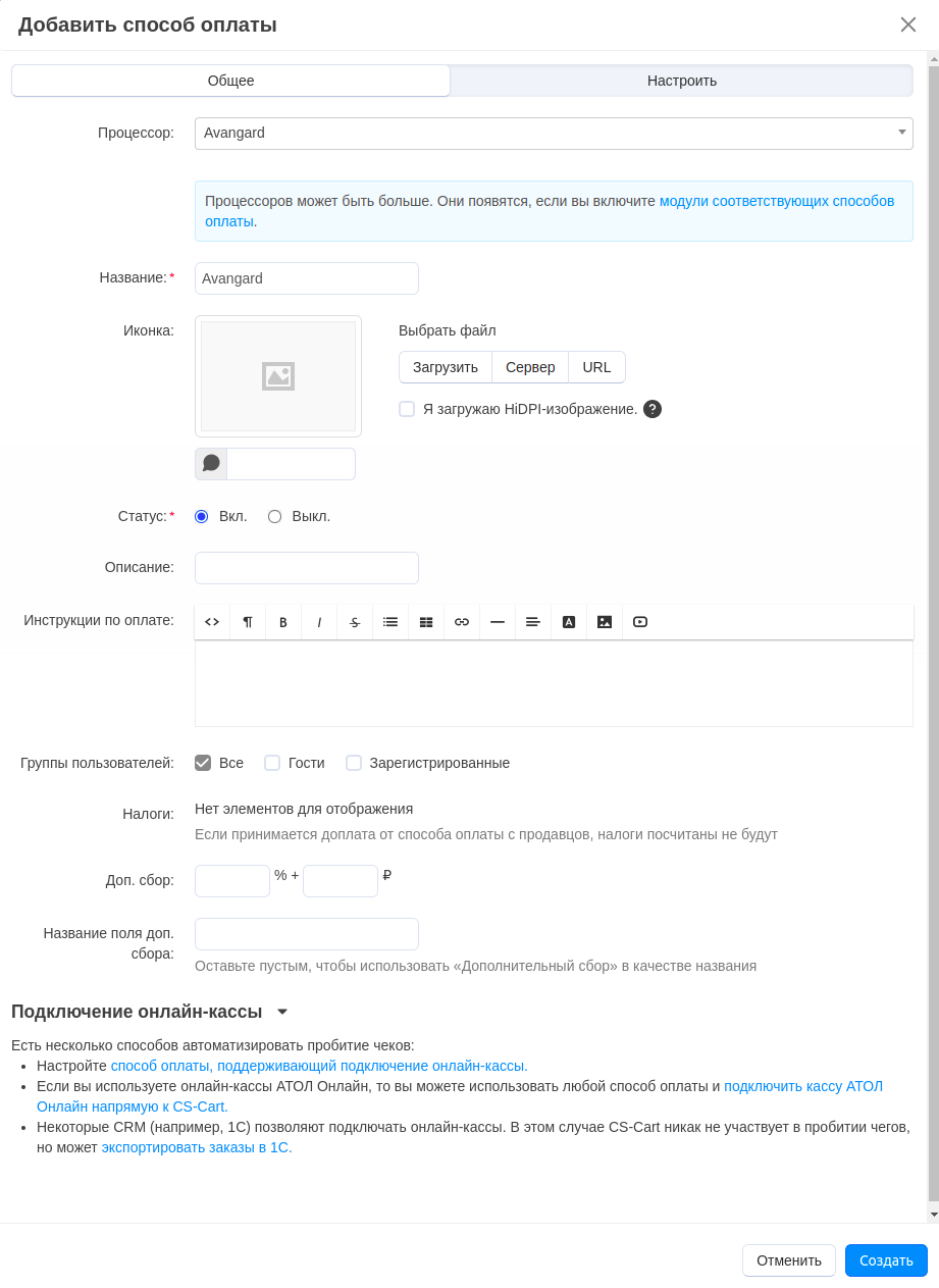 Выберите процессор оплаты “Avangard” в окне редактирования способа оплаты.