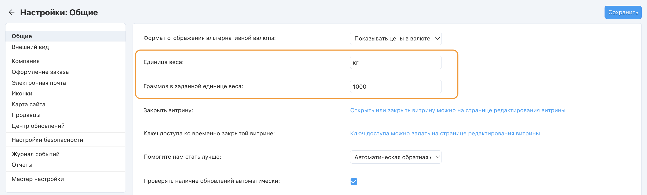 Изменить единицу измерения веса в магазине можно на странице Настройки → Общие настройки.