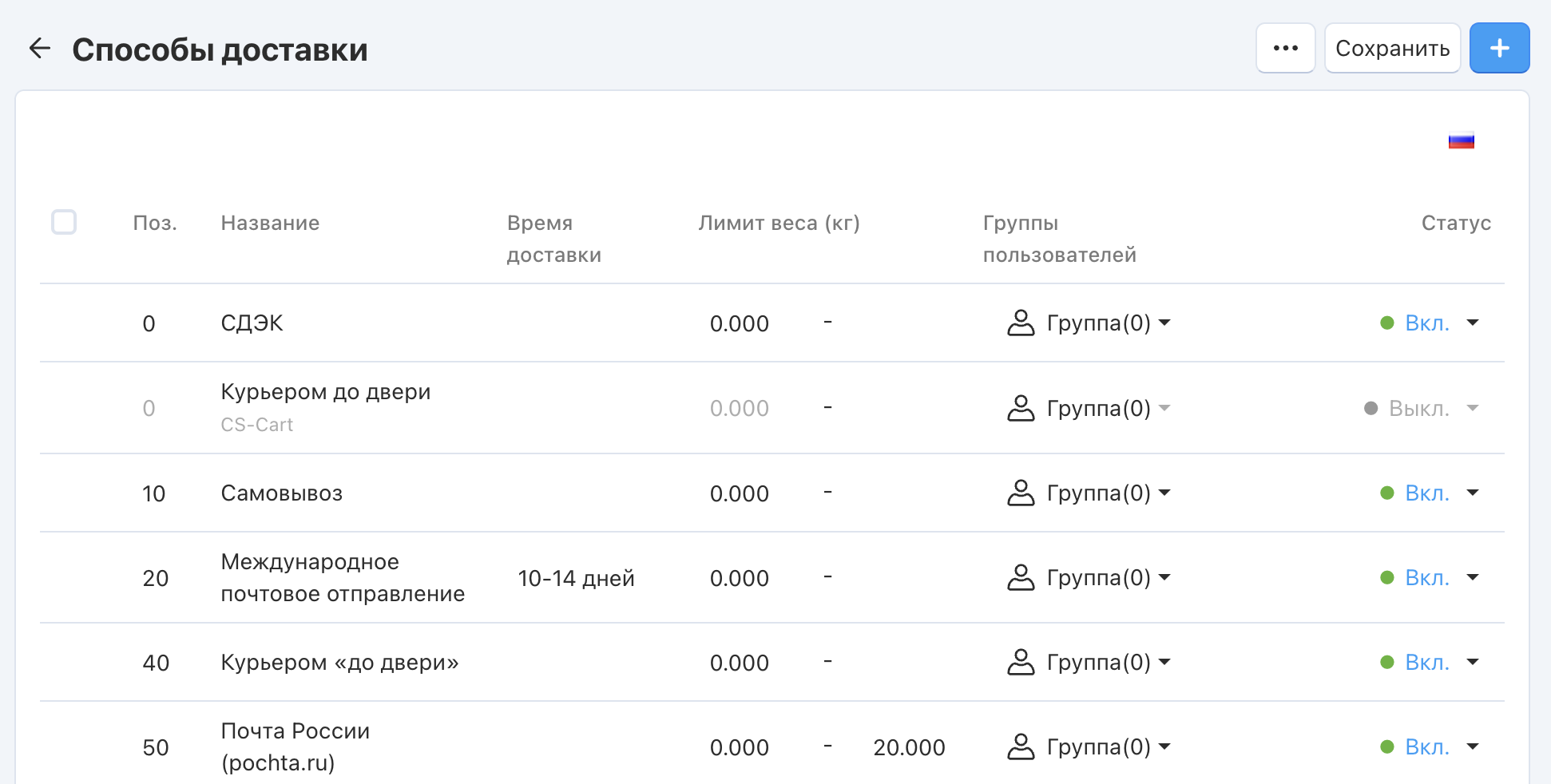 Список способов доставки можно отредактировать на странице Настройки → Способы доставки. Способ доставки в CS-Cart — это набор правил, который позволяет автоматически рассчитывать стоимость доставки в зависимости от: