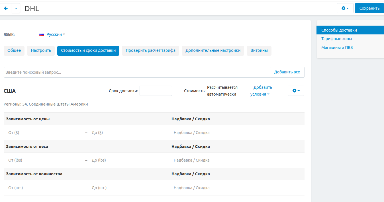 Нажмите Добавить условия рядом с названием выбранной тарифной зоны. В выпадающем списке в полях Зависимость от цены, Зависимость от веса, Зависимость от количества и Надбавка/Скидка можно ввести необходимые суммы. Эти суммы будут добавлены к стоимости, которую вернёт калькулятор стоимости доставки.