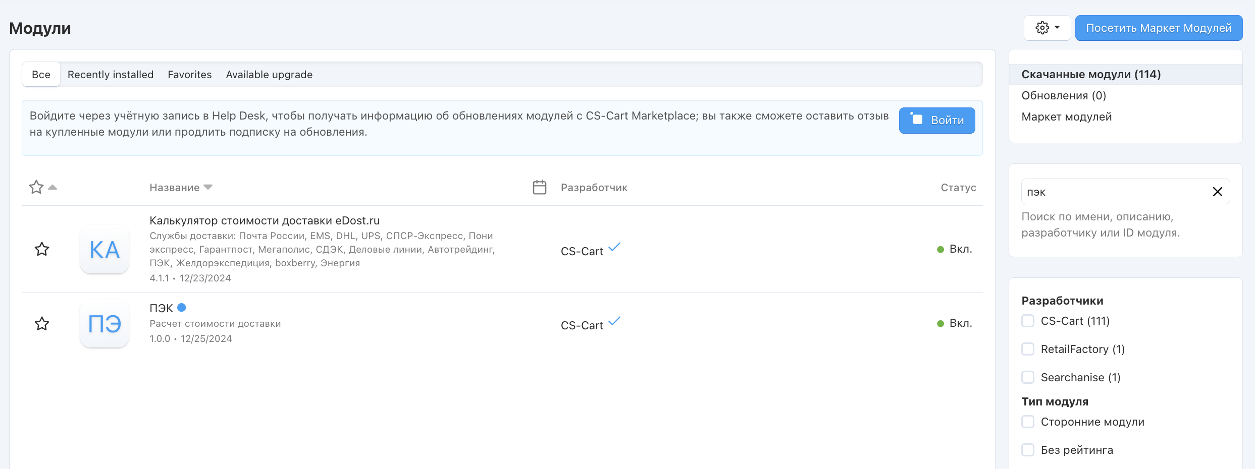 Автоматический расчёт стоимости доставки ПЭК входит в Русскую версию CS-Cart.