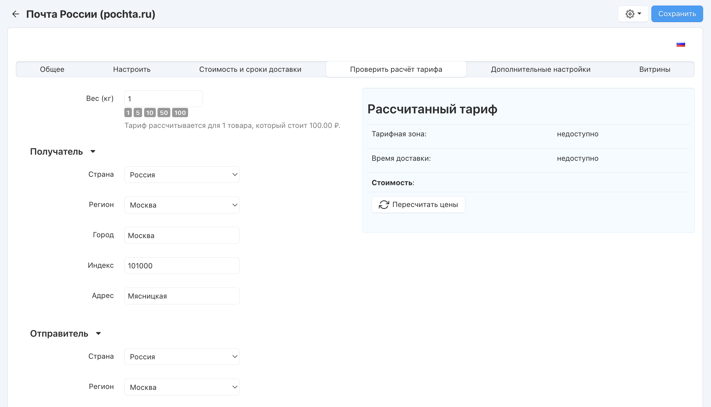После того, как вы настроите способ доставки, нажмите кнопку Сохранить. Тогда вы сможете перейти на вкладку Проверить расчёт тарифа и рассчитать стоимость доставки, как описано ниже.