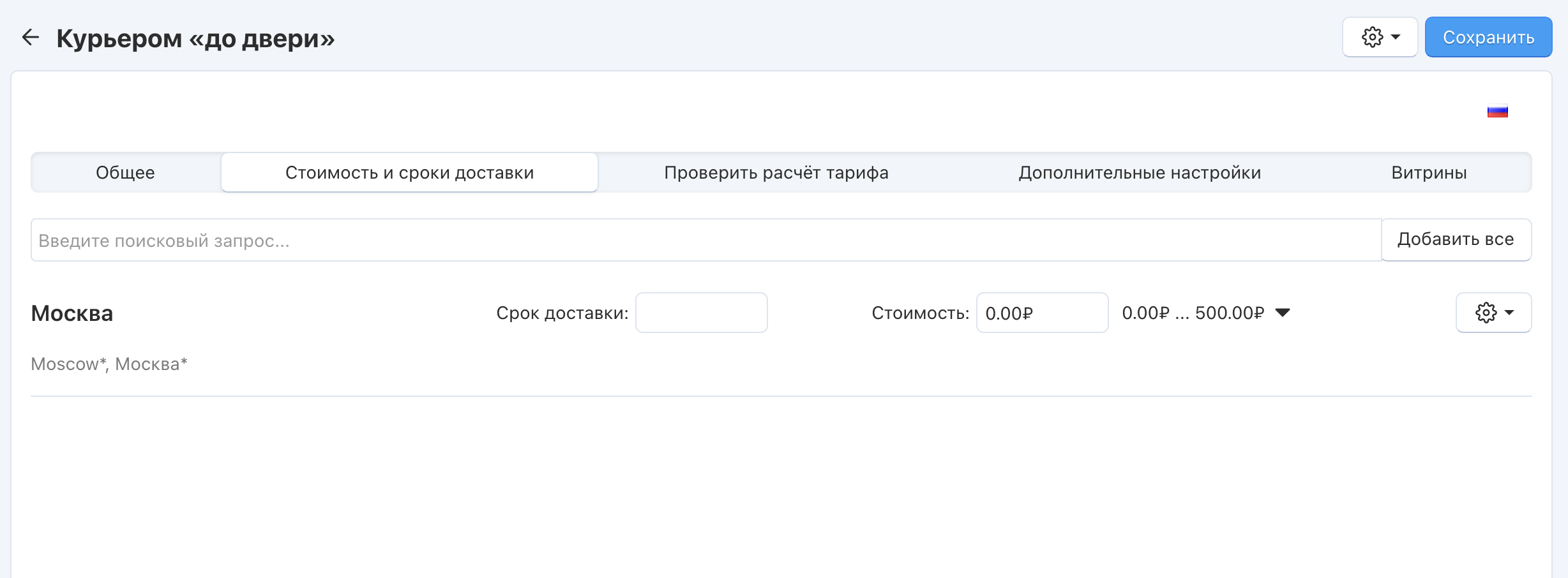 В настройках способа доставки перейдите на вкладку Стоимость и сроки доставки.