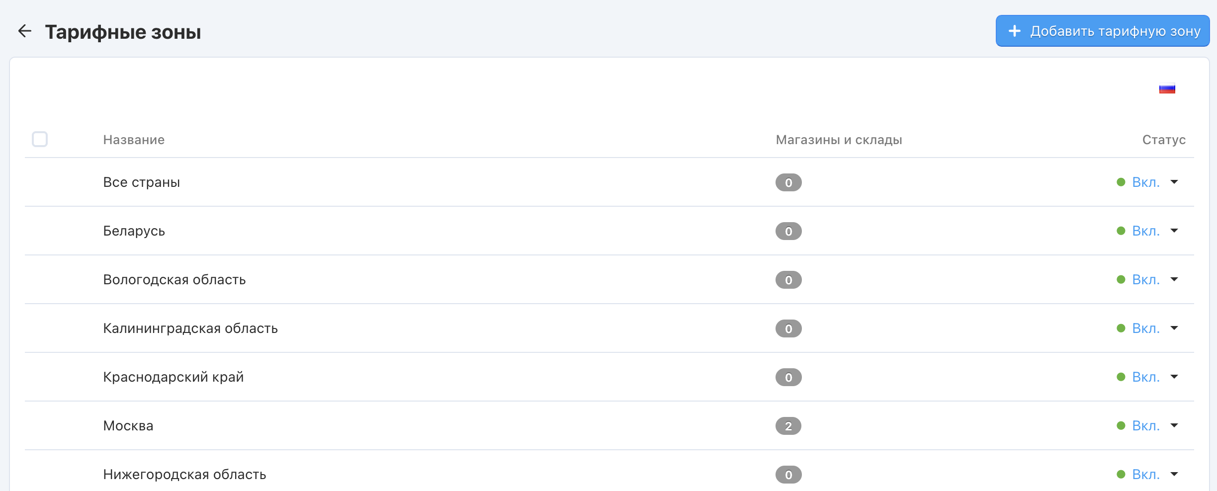 Откройте страницу Настройки → Способы доставки → Тарифные зоны.