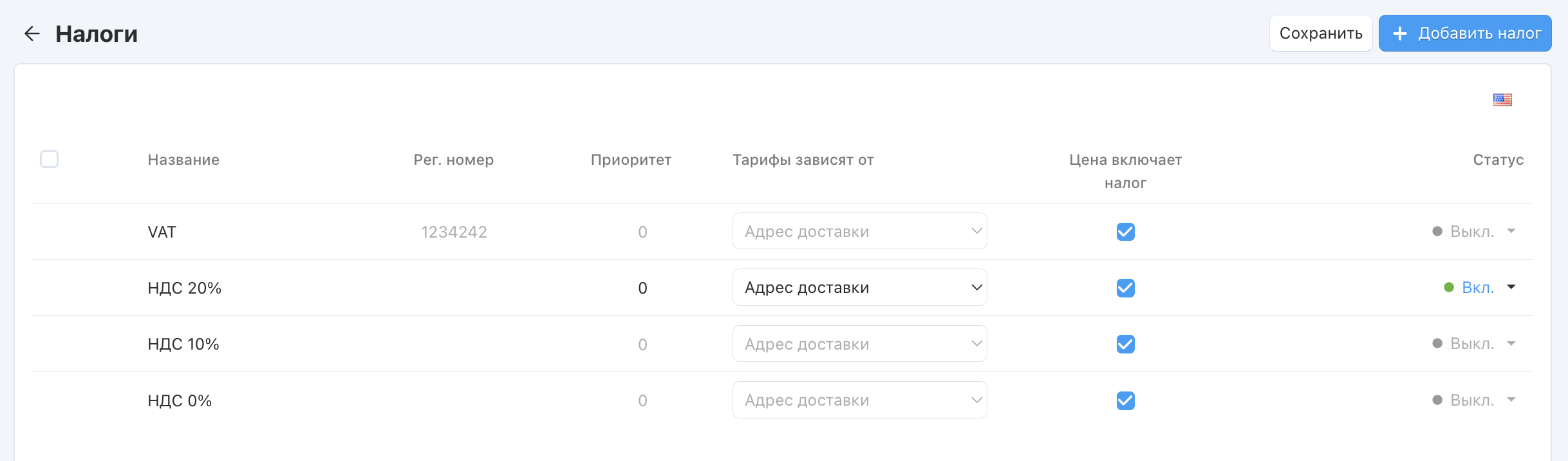 Чтобы включить или выключить налог, поменяйте его статус на Вкл. или Выкл. соответственно.