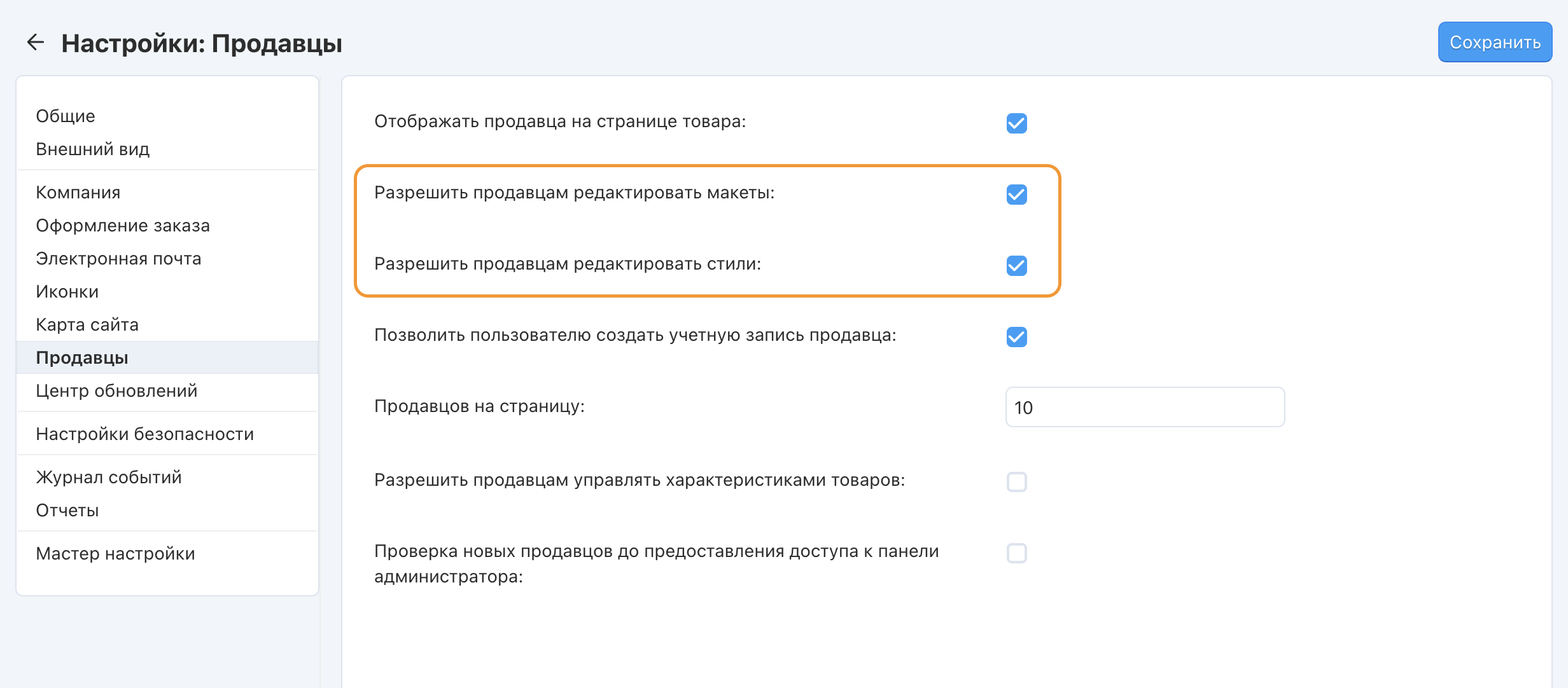 • Разрешить продавцам редактировать макеты — позволяет продавцам редактировать страницы макета.