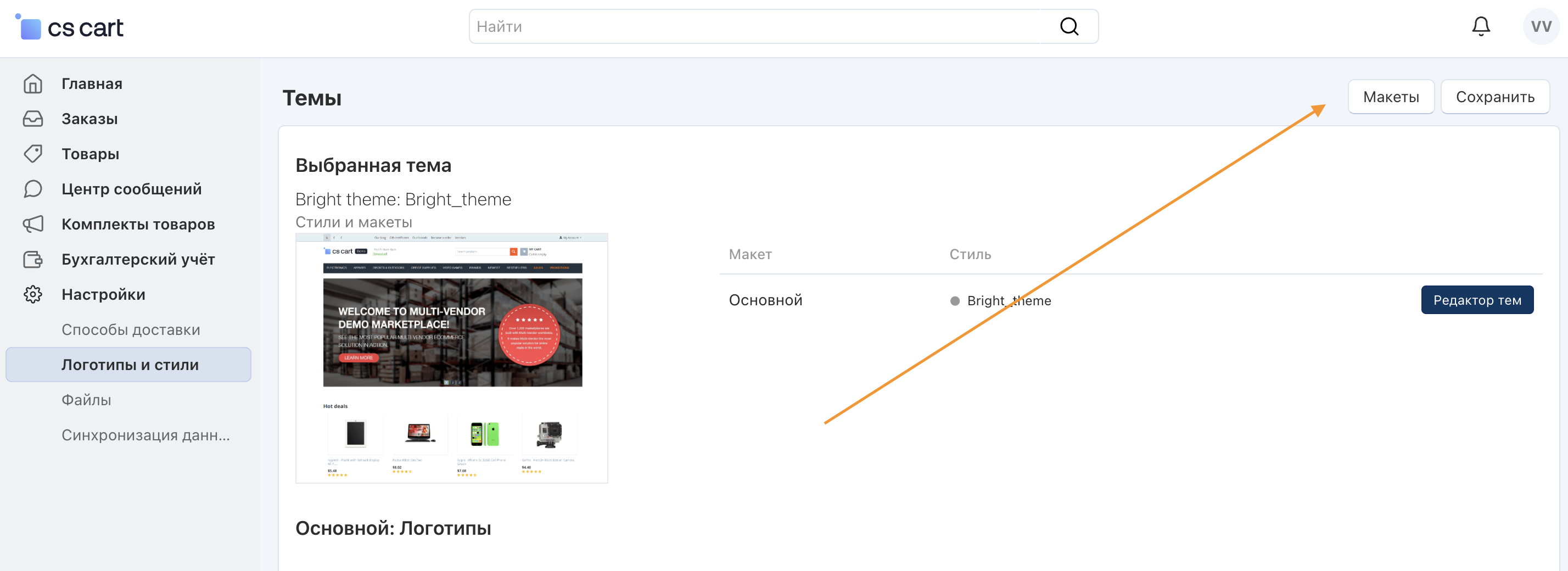 2. Откройте страницу Настройки → Логотипы и стили → Макеты.