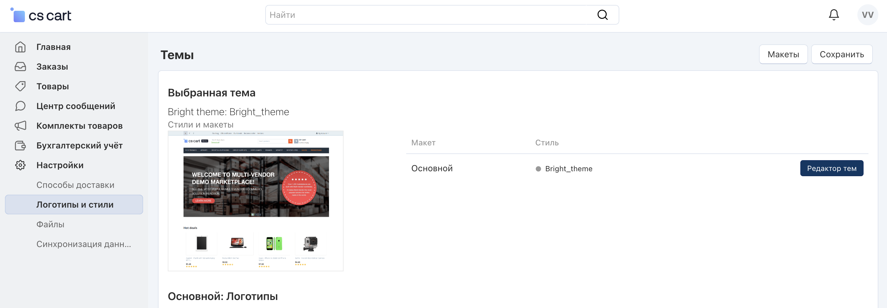 В редакторе тем у продавцов нет доступа к разделам Общие настройки и Логотипы.