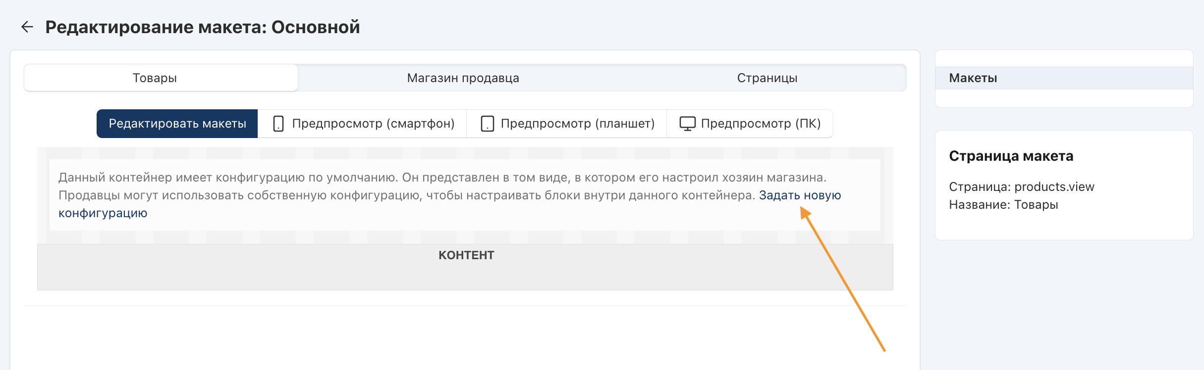 3. Во вкладках вы увидите страницы макета, которые могут редактировать продавцы. Обратите внимание, что для редактирования продавцам доступны не все контейнеры, а только Контент.