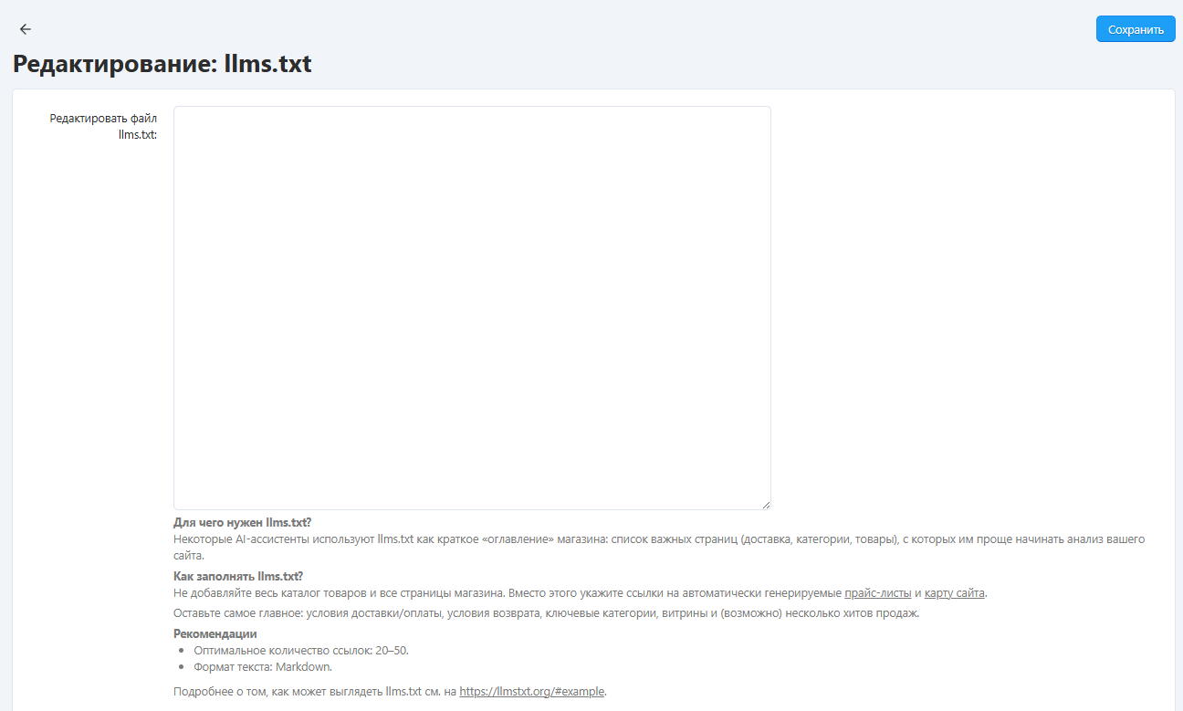 В правом верхнем углу нажмите кнопку Llms.txt. Откроется окно, в котором можно начать заполнение файла: