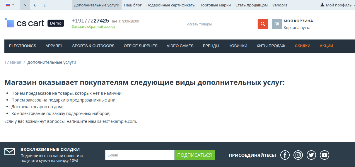 В этой статье мы поэтапно разберем как создавать служебные страницы в магазине (например, политику возвратов и т.п.) и как изменить их внешний вид.